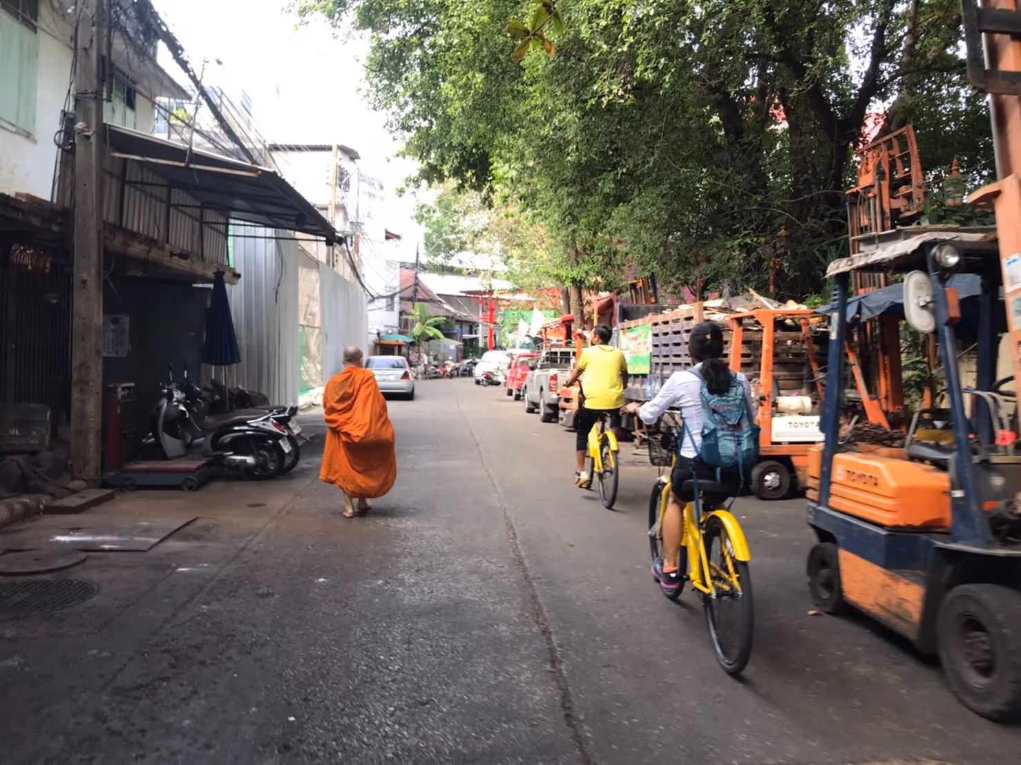 Starting in the heart of Chinatown, our bike ride explores its frenetic market environment. Winding through narrow alleyways, our senses come alive with the sights, sounds, and smells of a community in motion. We’ll pass by shophouses selling everything from Buddhist amulets to recycled truck engines. Locals worshiping at hidden temples, ritual paper burnings, and the omnipresent spirit house display evidence of a culture centuries in the making.